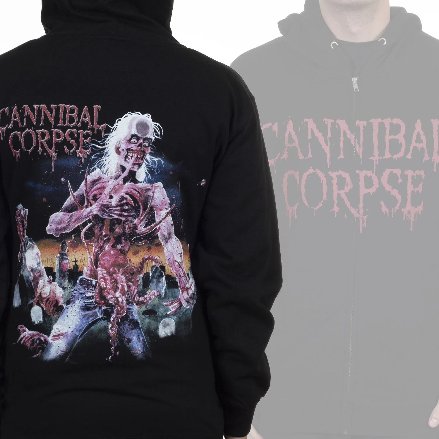 Cannibal Corpse “Eaten Back To Life“ two-sided zip up hoodie! Features the band logo on the front and the album art of the same name on the back. A must-own piece of merchandise for Cannibal Corpse fans!