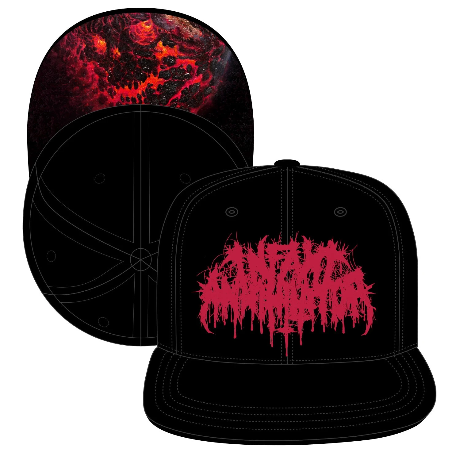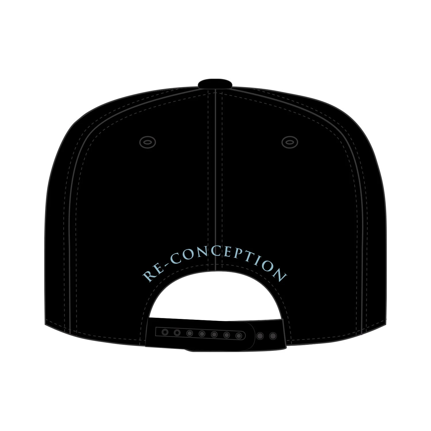 -black snapback with front + back embroidery, plus underbill printing