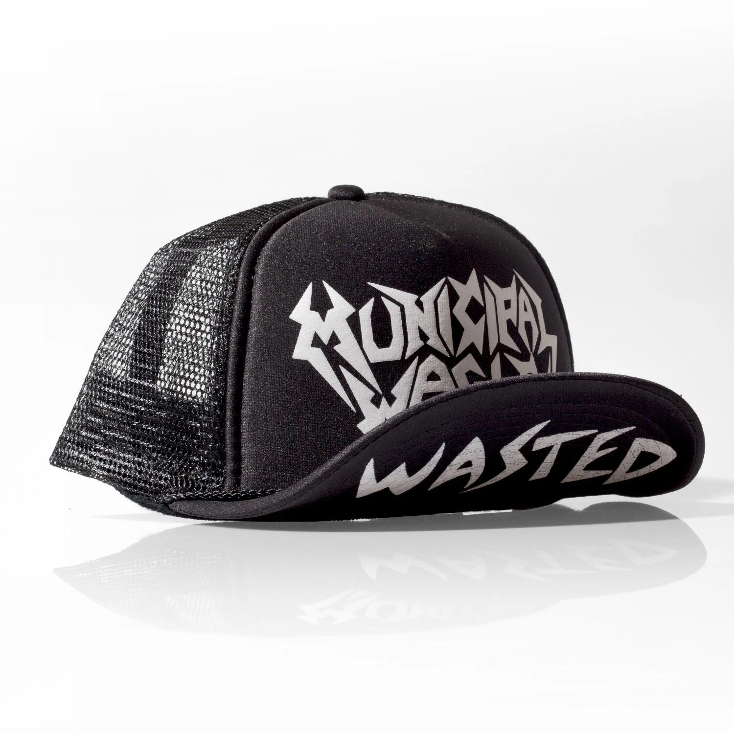 Wasted trucker hat from Municipal Waste. Features bands logo with “Wasted” underneath brim. The latest album from Municipal Waste is “Slime and Punishment.”