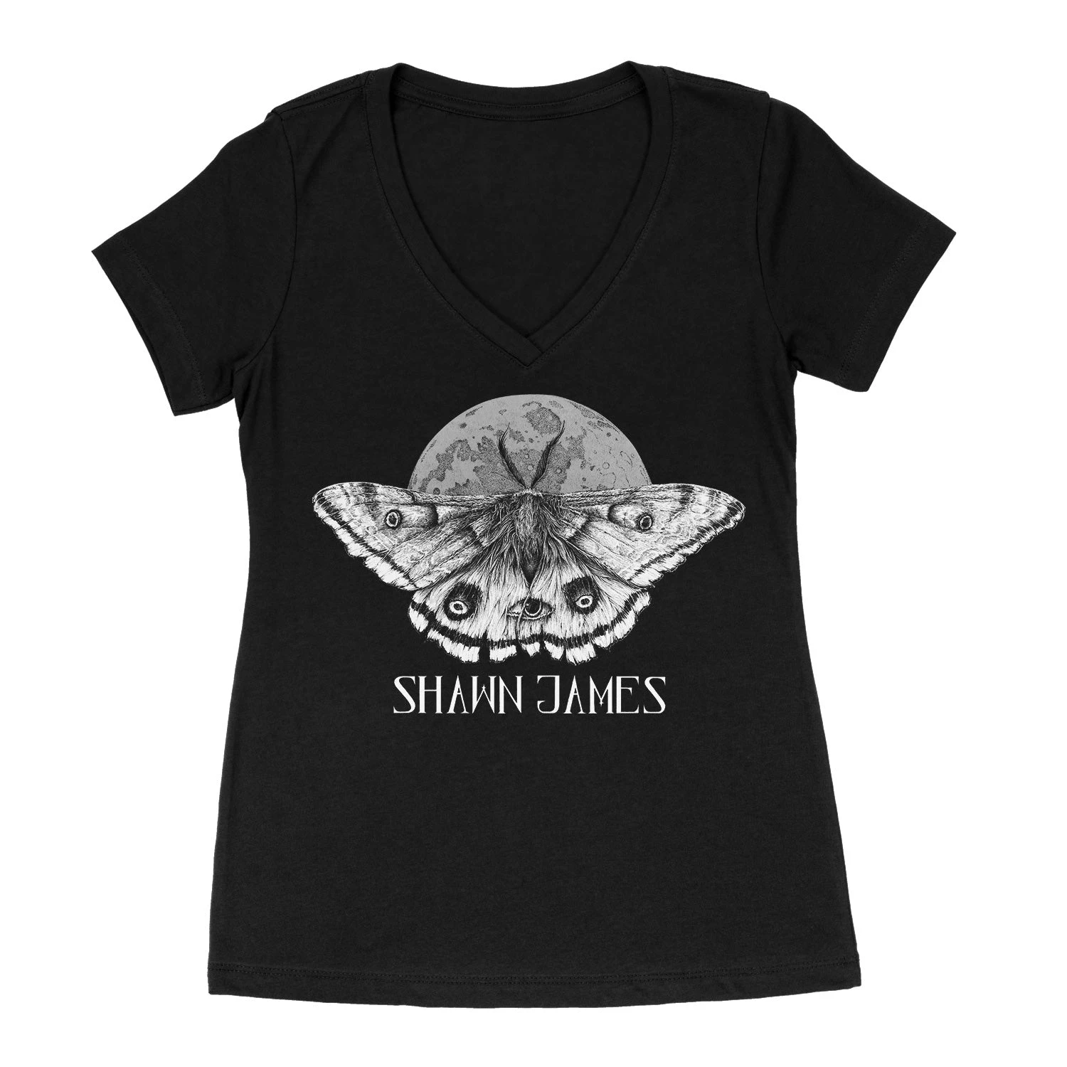 Shawn James “Moon Moth” one-sided black women’s v-neck t-shirt